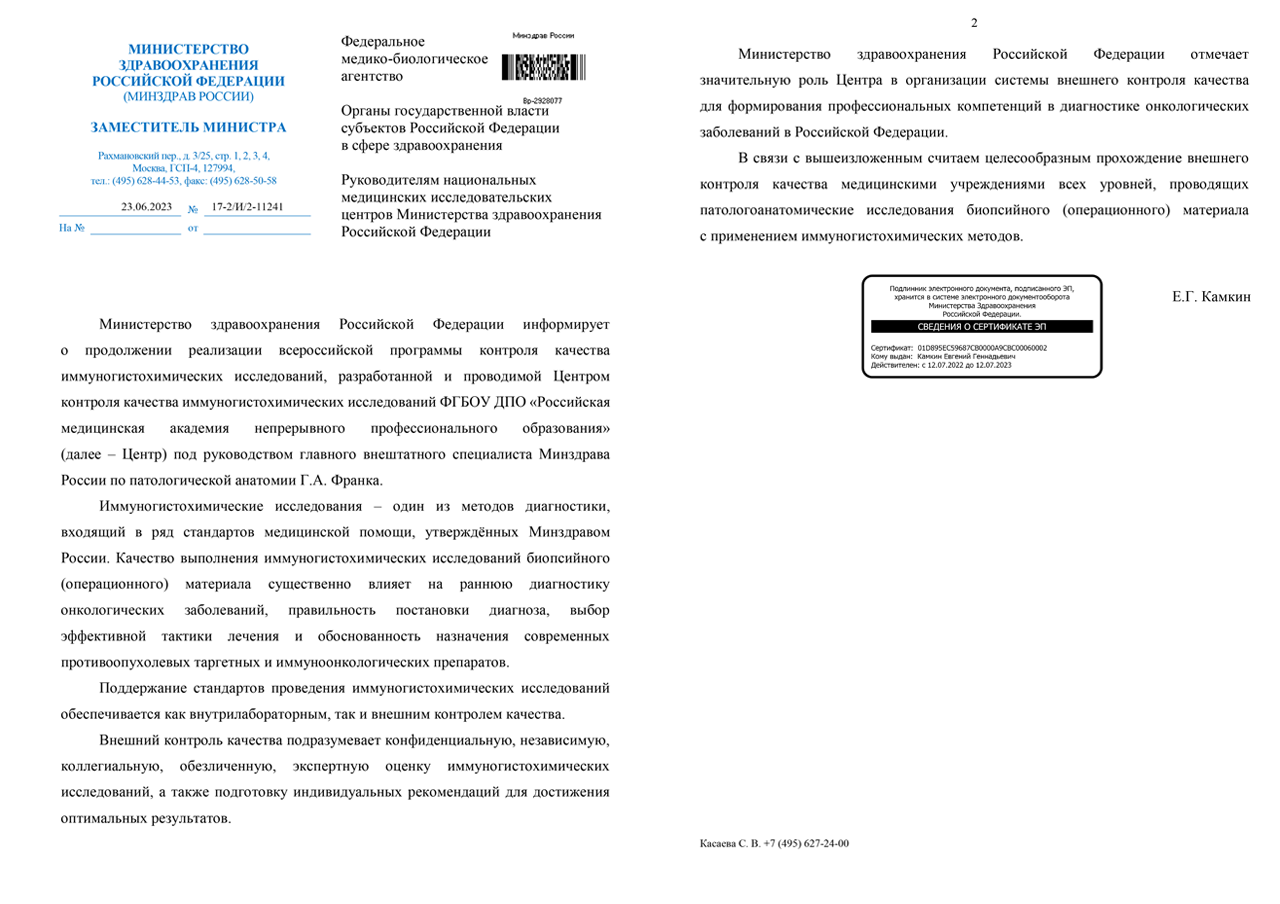 Министерство здравоохранения Российской Федерации своими письмами № 17-2/2809 от 19.04.2018, № 17-2/И/2-8454 от 19.07.2019, № 17-2/И/2-16077 от 23.10.2020 и № 17-2/И/2-11241 от 23.06.2023 отметило успешную реализацию Всероссийской  программе контроля качества и  рекомендовало учреждениям всех уровней, проводящим патологоанатомические исследования биопсийного (операционного) материала с применением иммуногистохимических методов, участие в программе контроля качества.